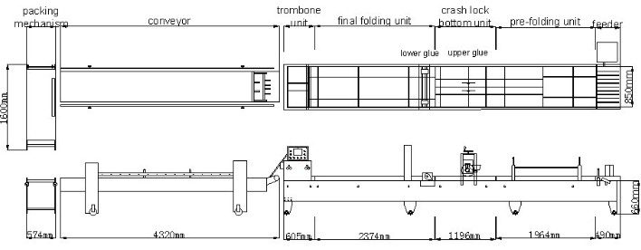 The machine has the following seven parts: Feeding unit, Pre-folding unit, Crash lock bottom unit, Gluing unit, Final folding unit, Trombone unit, and Conveying unit.
