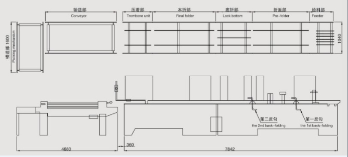 The machine has the following seven parts: Feeding unit, Pre-folding unit, Back-folding unit, Crash lock bottom unit, Gluing unit, Final folding unit, Pressing unit, and Conveying unit.