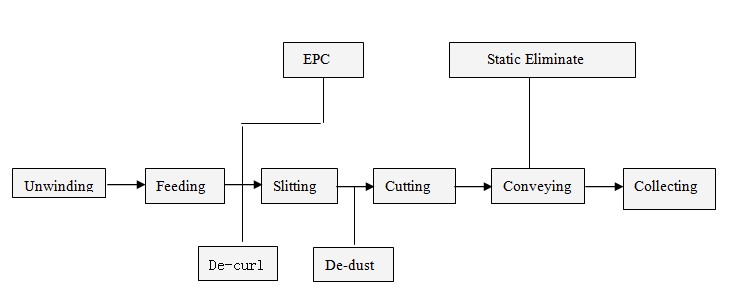 As technics of our machine, we hereby describe the related functions and work flow for paper products: unwinding→ cutting → conveying → collecting → Packaging.